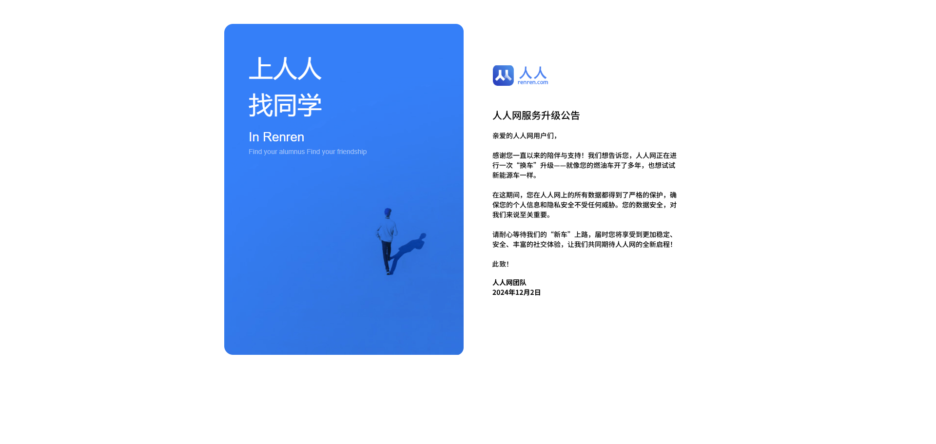 請耐心等待我們的“新車”上路,屆時您將享受到更加穩(wěn)定安全、豐富的社交體驗(yàn),讓我們共同期待人人網(wǎng)的全新啟程!